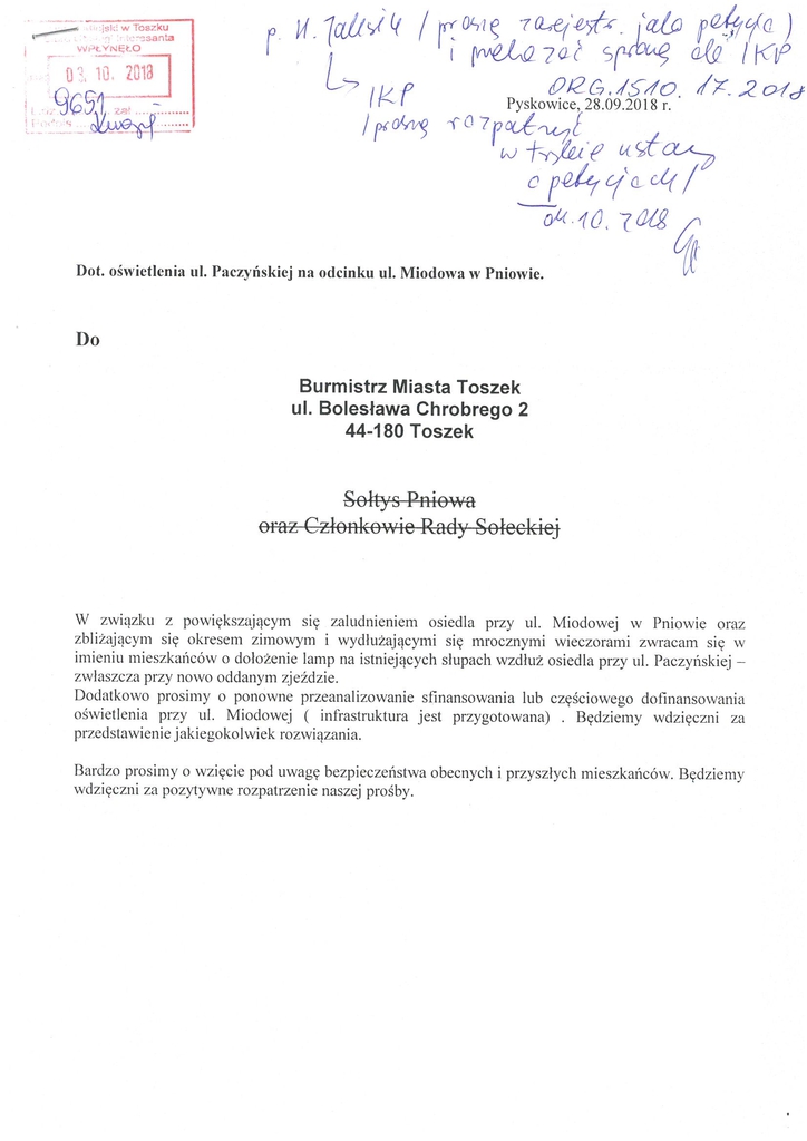 Petycja w sprawie budowy oświetlenia ulicznego na odcinku ul. Paczyńskiej i ul. Miodowej w Pniowie