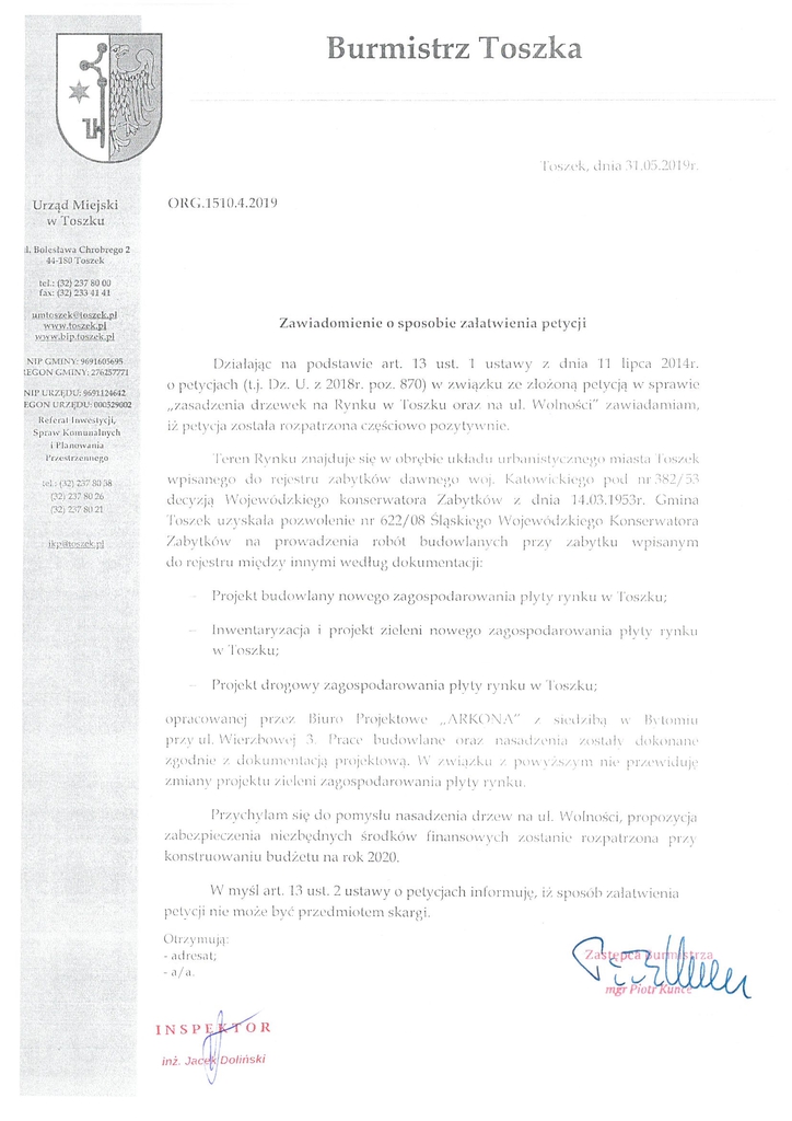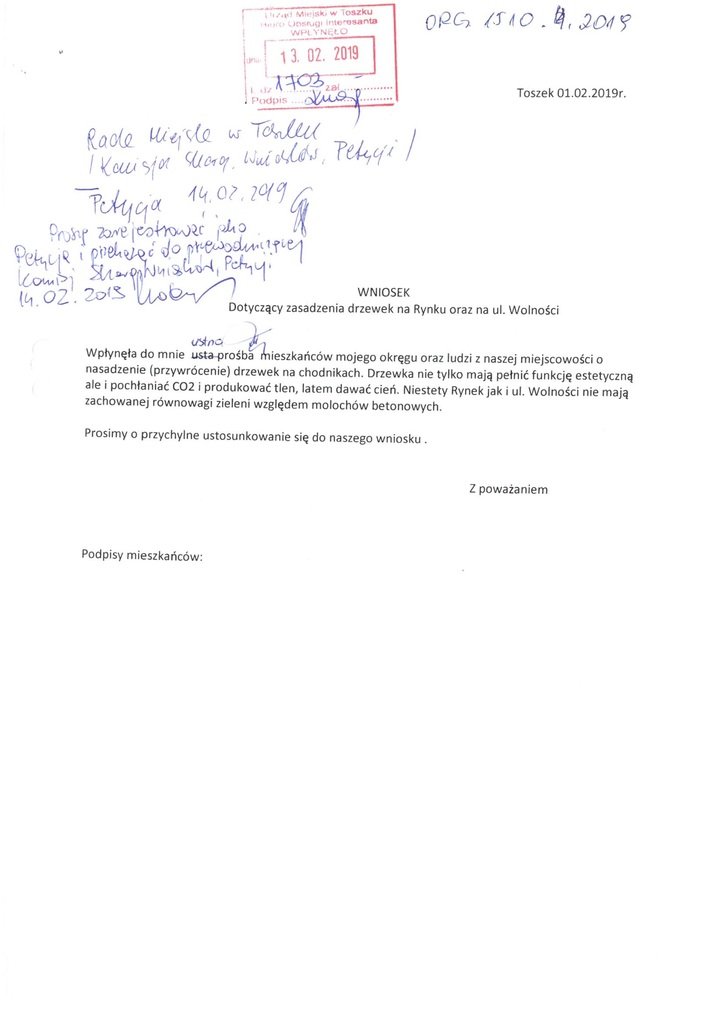 Petycja z dn. 07.03.2019 w sprawie "zasadzenia drzewek na Rynku oraz na ul. Wolności"