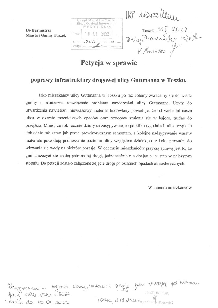 Petycja w sprawie poprawy infrastruktury drogowej ul. Guttmanna w Toszku